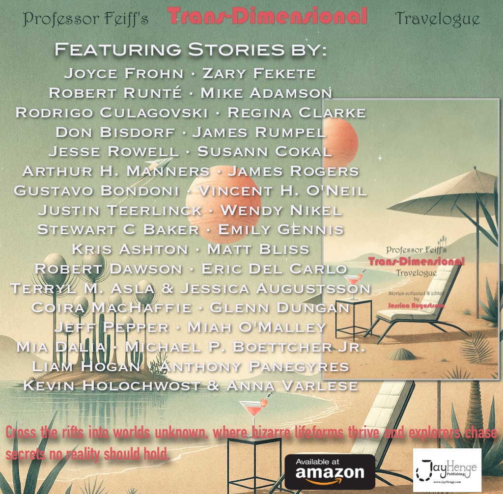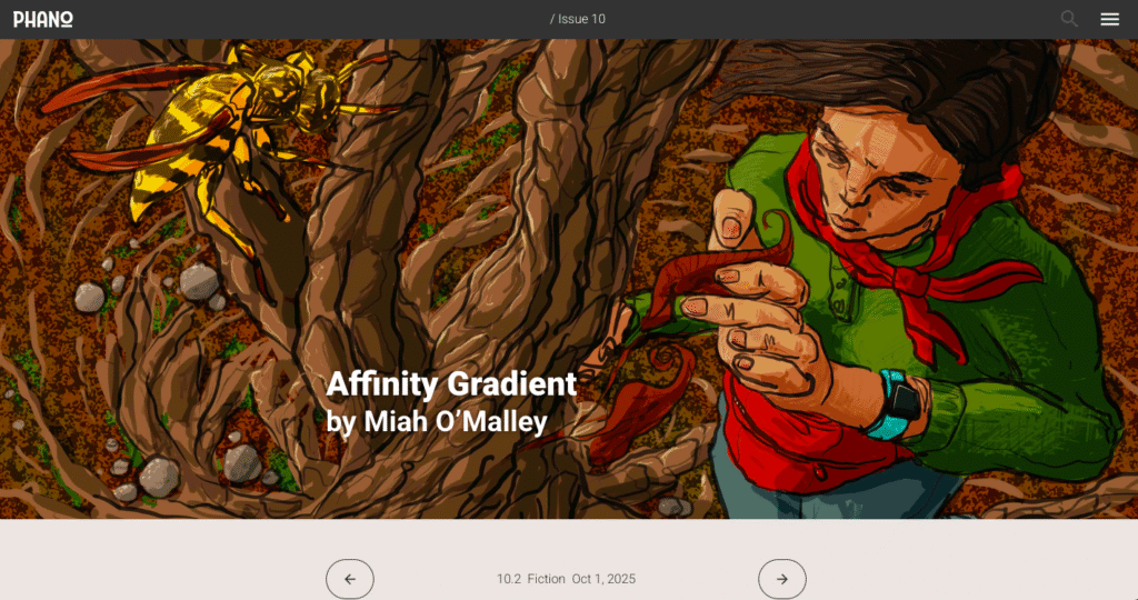 “Sleepholder”, Radon Journal – Issue 11 “We Were Home”, Tethered Literary – Summer 2025 “Glimmer Year”, Exposed Bone III “Affinity Gradient”, Phano issue 10 “Gleaming Integument”, Trembling With Fear “The Abandoned Planets of Aediama“, Professor Feiff’s Trans-Dimensional Travelogue